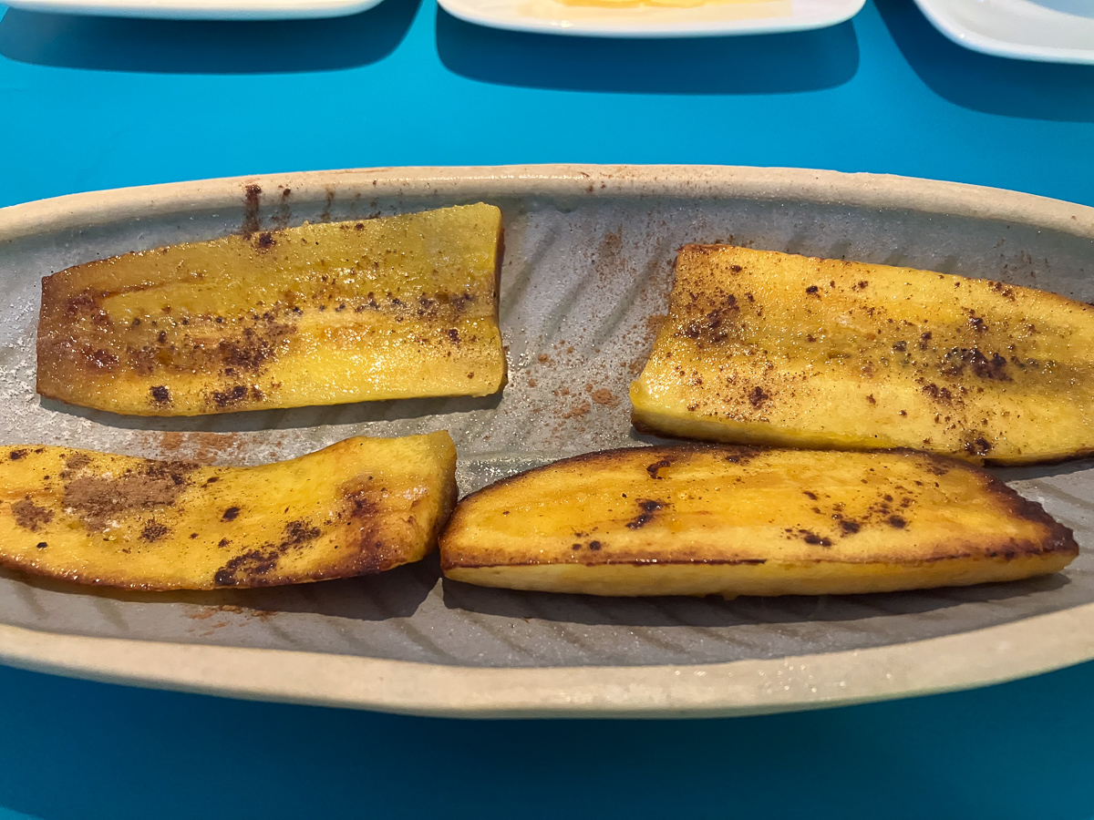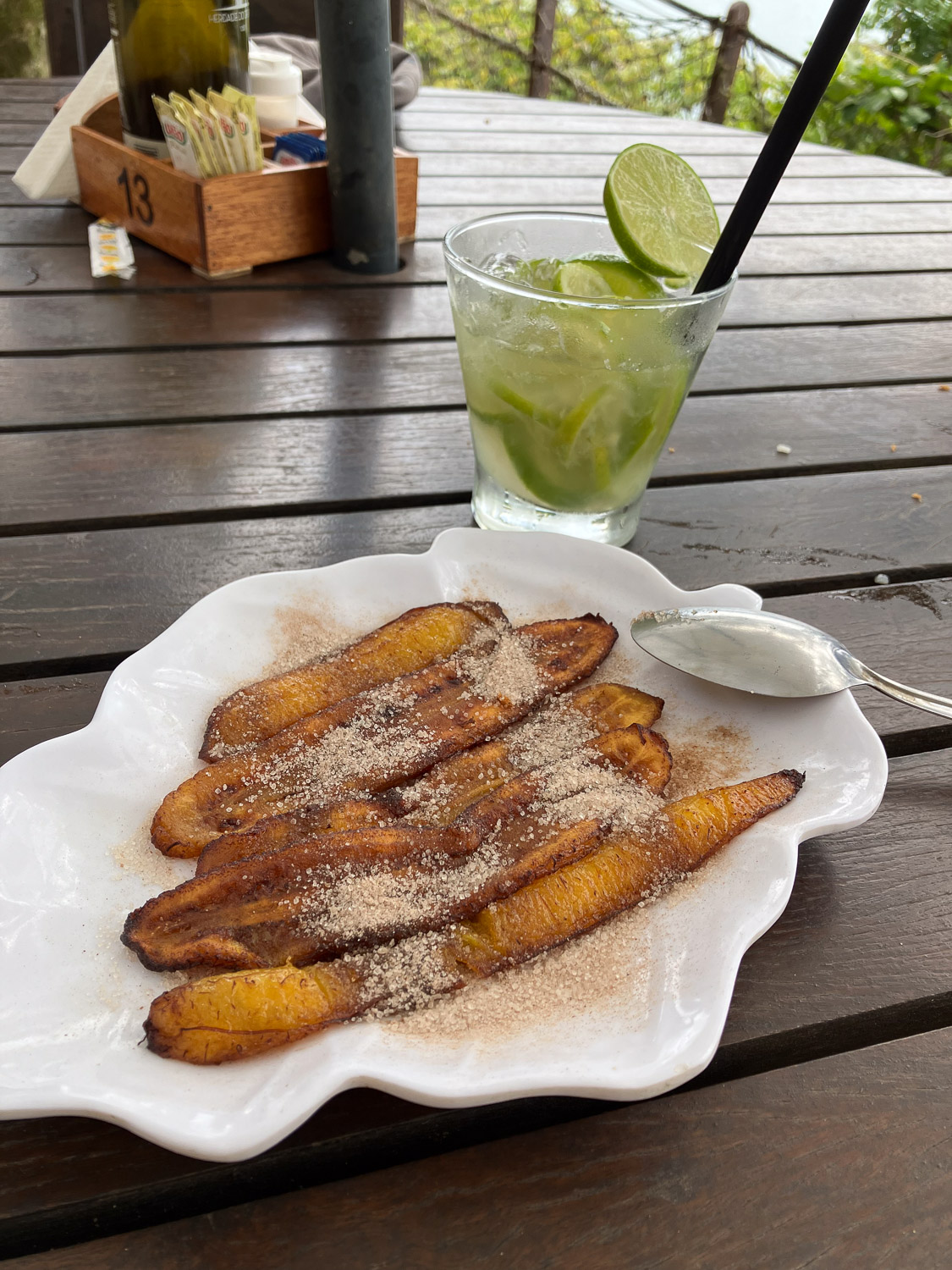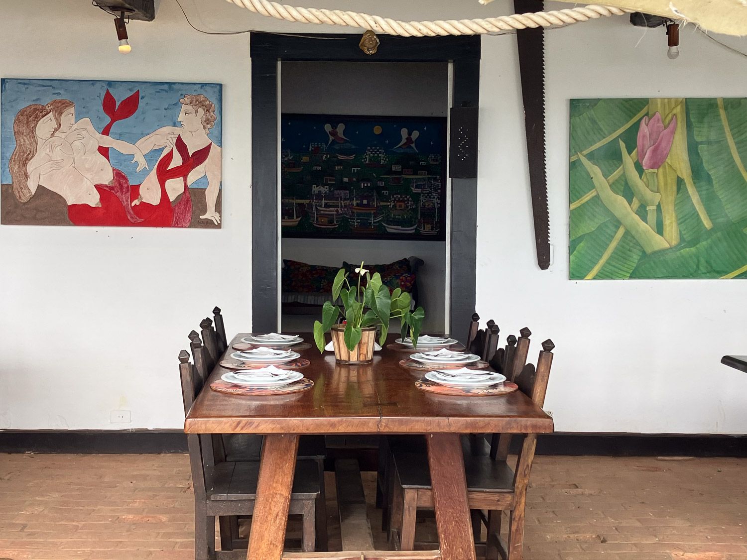 Max played his flute as we drew close to the restaurant. Reviews of the place are rather mixed, with some complaining that the service was slow, so maybe that was Max’s way of telling them that we were coming. More likely, he just felt like playing his flute. Whatever the reason, we had an excellent experience with great food in the lovely surroundings of the restaurant. Best fried bananas on the whole trip – and interesting artwork too!
